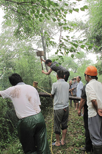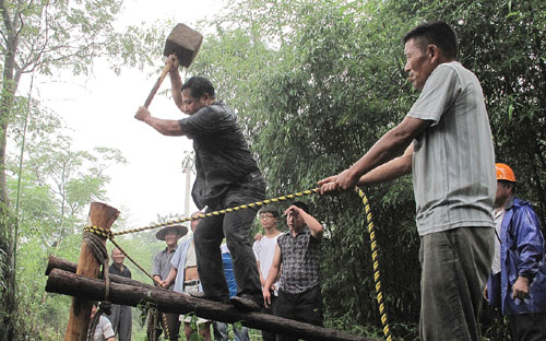 由于受到强降雨的影响,河水暴涨,导致良朋、晓云斗堤全线告急,已有良朋斗堤1处、晓云斗堤3处垮塌,最长处30余米。 险情发生后,良朋镇主要领导挂帅指挥防洪抢险工作,已组织民兵应急分队500人,分8个组到良朋、晓云斗堤打桩、堵塞管涌。到今天晚上9点,500仍然奋战在抗洪一线。 图为干部群众正在打桩保堤。