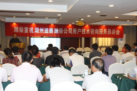 潍柴重机湖州迪赛潍柴公司于8月21日至22日在安吉凯旋门大酒店召开2010年度用户技术咨询服务恳谈会。邀请了潍柴重机技术中心胡高工等数位专家作技术指导。安吉、长兴、德清县海事处领导非常重视这次活动并亲临现场。安吉、长兴十几家造船企业负责人亲自带班前来听课,上百位用户非常感谢迪赛公司提供的这次学习机会。
