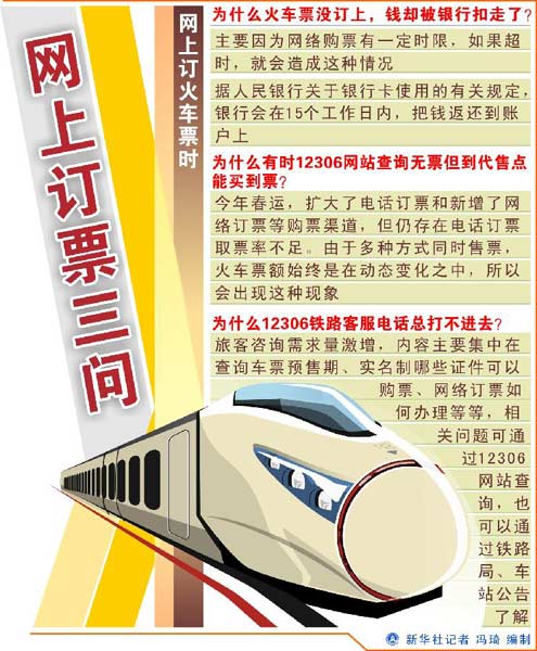 针对有旅客反映网上购票时,车票没订上,钱却被扣了的问题。铁路部门解释,出现这种情况,主要是因为网络购票有一定时限,必须在30分钟内完成,如果超时,票额就会重新返回售票系统,造成票没订上,钱被扣了的现象。根据人民银行关于银行卡使用的有关规定,银行会在15个工作日内,把钱返还到旅客订票帐户上。目前,铁路部门已增加了网络购票的支付时限,尽量减少这种现象。(