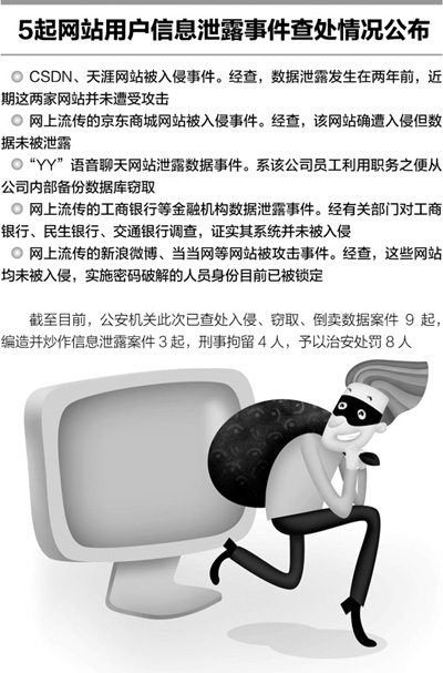 国家互联网信息办发言人今天(10日)说,近期一些媒体报道或在网上流传的数家网站用户信息被泄露的事件,引起互联网管理部门的高度重视,相关事实已由公安机关查明,违法人员已经或将要被依法严肃查处。