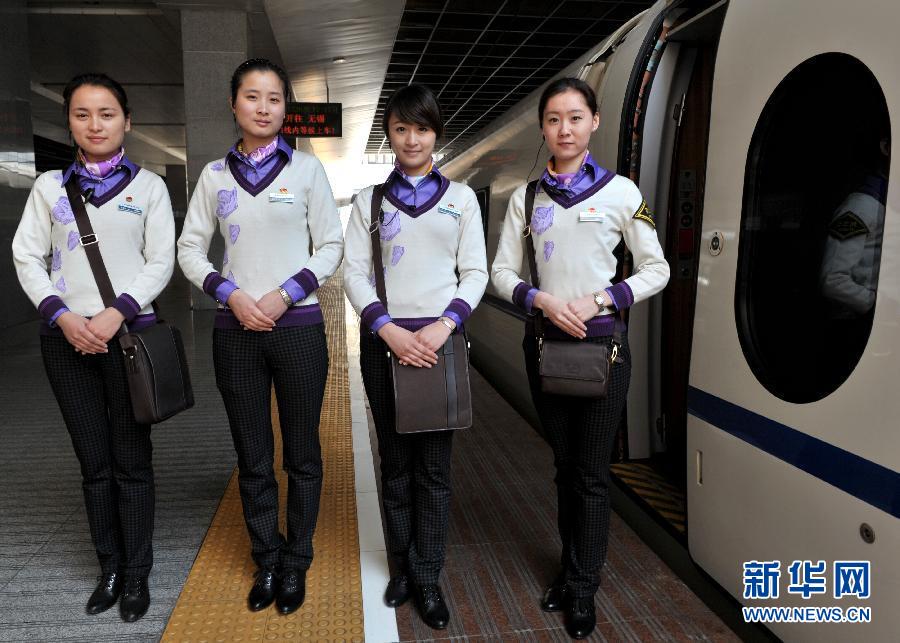 4月2日至4月4日清明节小长假期间,上海铁路局所有高铁、动车组列车乘务员首次换上“高铁休闲装”,以清新的面貌出现在旅客面前。根据上海铁路局最新规定,今后高铁乘务员逢双休日及法定节假日将穿着休闲装上岗,工作日统一穿正装上岗。首次亮相的“高铁休闲装”包括:紫色衬衫、白色羊毛衫、彩色丝巾、黑色皮鞋等。图为4月4日,沪宁高铁乘务员穿着休闲装上岗。