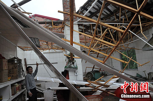 图为狂风掀开屋顶,厨房一片狼藉。