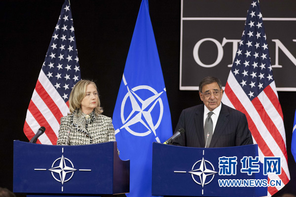 4月18日,在比利时布鲁塞尔北约总部,美国国务卿希拉里·克林顿(左)与美国国防部长帕内塔在北约外长与防长会议期间举行新闻发布会。美国报纸《洛杉矶时报》当日头版曝光美军士兵涉嫌侮辱阿富汗武装人员尸体的照片。美国国防部长帕内塔等人随即发表声明,强烈谴责这些士兵的行为,并称正对事件展开调查。新华社发(莫纳斯摄)