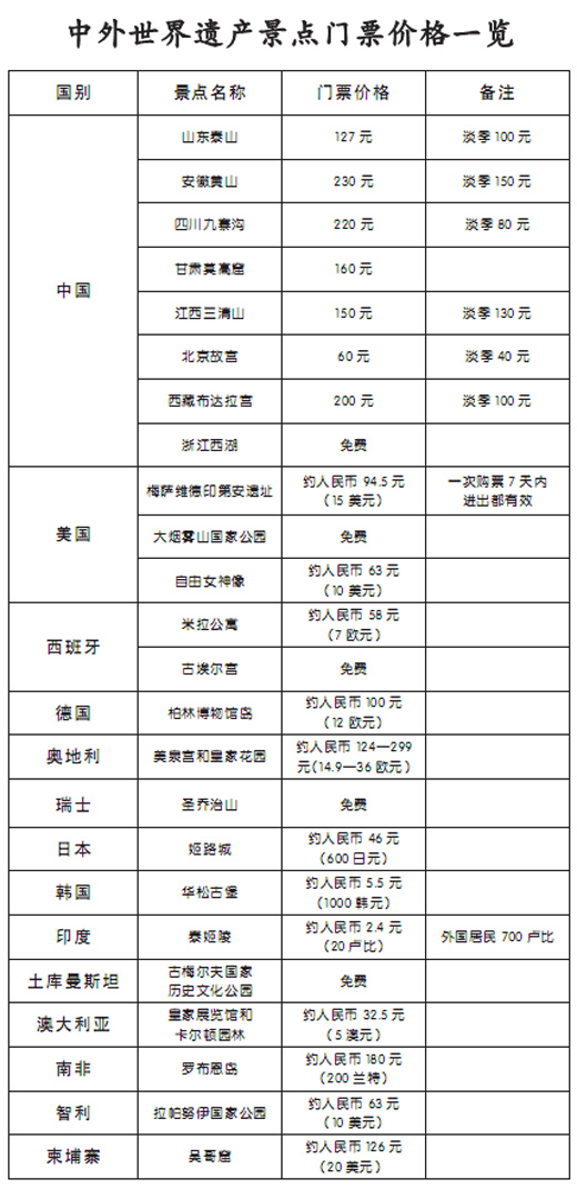 为了求证传言,记者选择中外知名的“世界自然遗产”、“世界文化遗产”,就门票价格问题进行专题比对。