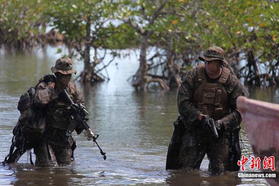 4月25日,美国与菲律宾“肩并肩2012”联合军演参演部队在菲律宾南部巴拉望省普林塞萨港市的阿鲁甘湾举行“两栖登陆”演练,美菲双方近百名海军陆战队士兵参加。这也是美菲“肩并肩2012”联合军演开幕10天以来,开放媒体采访规模最大的一场军事演习活动。图为美菲海军陆战队先遣小分队登上滩头。记者 张明 摄