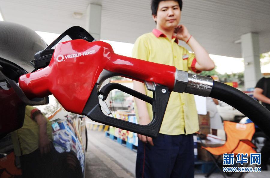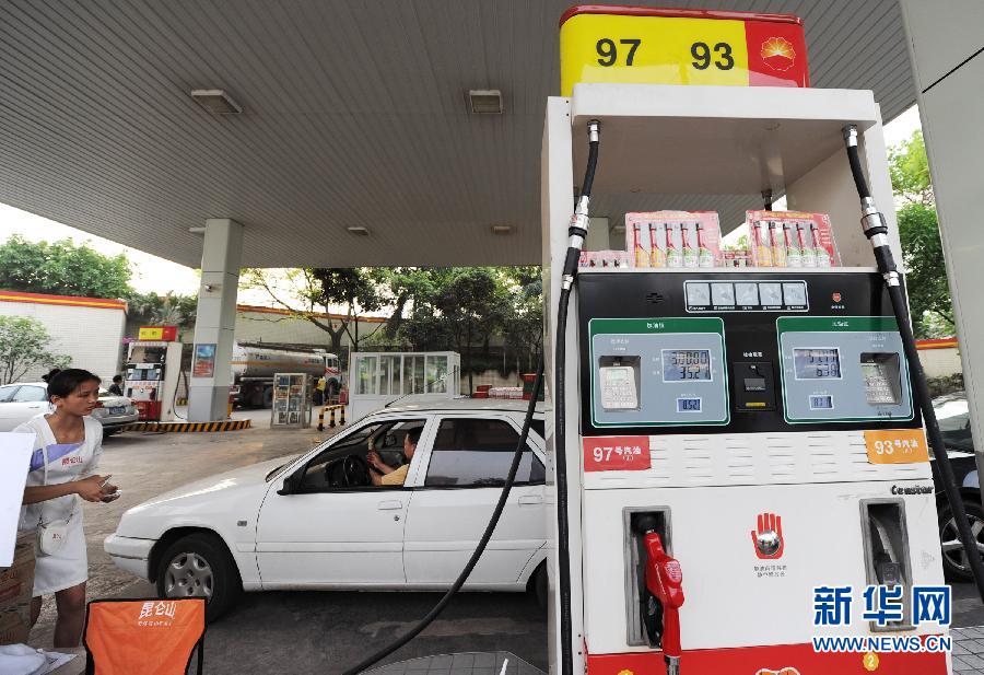 5月9日,重庆江北区一中石油加油站工作人员在为顾客加油。据国家发改委消息,5月10日零时起,汽柴油价每吨分别下调330元和310元,折合零售价90号汽油和0号柴油每升分别下调0.24元和0.26元。这是今年来我国首次下调成品油价格。新华社记者 李健 摄