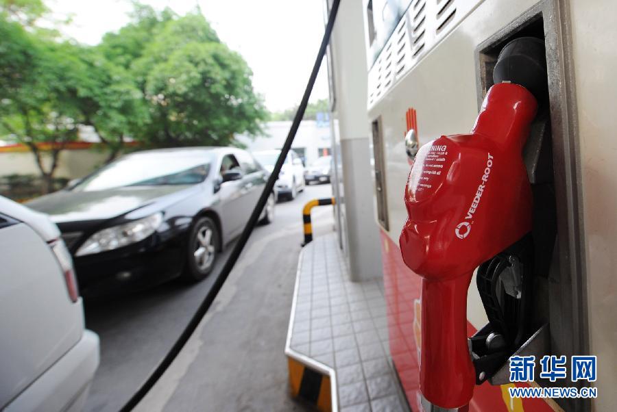 5月9日,在重庆江北区一中石油加油站,车辆在等候加油。据国家发改委消息,5月10日零时起,汽柴油价每吨分别下调330元和310元,折合零售价90号汽油和0号柴油每升分别下调0.24元和0.26元。这是今年来我国首次下调成品油价格。新华社记者 李健 摄