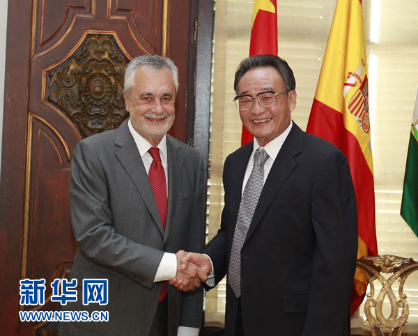 新华网西班牙塞维利亚5月27日电 正在西班牙进行正式友好访问的中国全国人大常委会委员长吴邦国当地时间27日下午在安达卢西亚自治区政府会见自治区政府主席格里尼安。