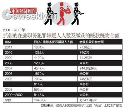 《中国经济周刊》从最高检历年“两会”上的工作报告整理得知,自2000年底最高检会同公安部组织开展追逃专项行动以来,至2011年,检察机关共抓获在逃职务犯罪嫌疑人18487名。而据最高检公开发布的2005、2007、2009—2011年五年的数据显示,我国这五年共缴获赃款赃物金额达到541.9亿元。
