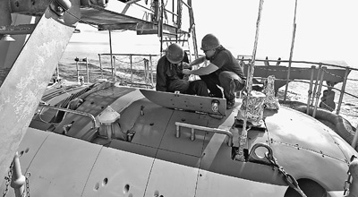 6月11日,参试队员在维护“蛟龙”号,保证潜水器保持在最佳状态,随时可以下潜。 新华社记者 罗 沙摄