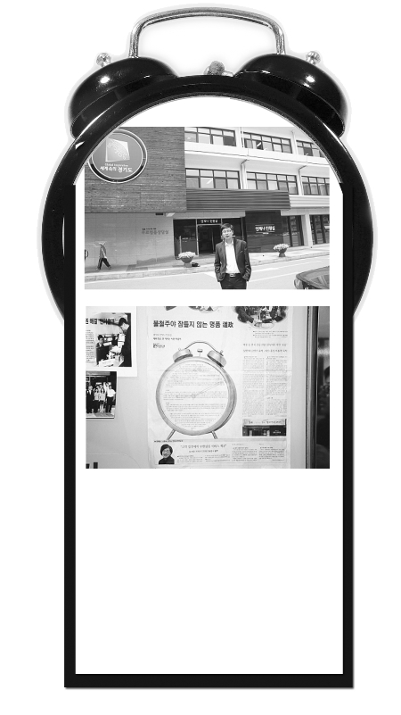 5月10日,《扬子晚报》特派记者周茂川一行造访韩国京畿道政府。在交流通商课门口,贴着一张醒目的报纸,整个版面被处理成一只大闹钟。