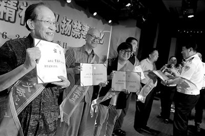 力助禁毒昨天,(北京)市公安局强制治疗管理处举办禁毒宣传活动。常宝华等演艺明星获颁禁毒义务宣传员证书。记者欧阳晓菲摄