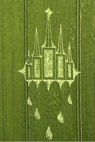 从照片中可清晰看出,麦田怪圈画有5个尖头的高塔屋顶和长方体,中间的高塔上还有颗类似星星放射光芒的图案,整体造型和去年英国王室举办婚礼的西敏寺外观相差无几;而麦田怪圈专家露西表示,这是麦田怪圈首次出现与教堂有关的图样。
