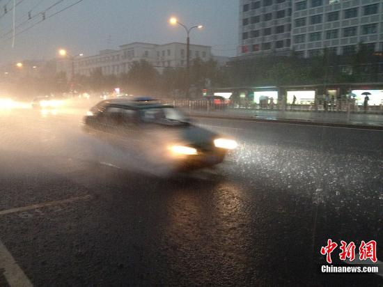 据北京市气象台30日下午17时发布的天气预报,傍晚到明天白天大雨,东南部地区有大到暴雨。图为7月30日晚7点左右车辆在大雨中行驶。中新网记者李美多摄