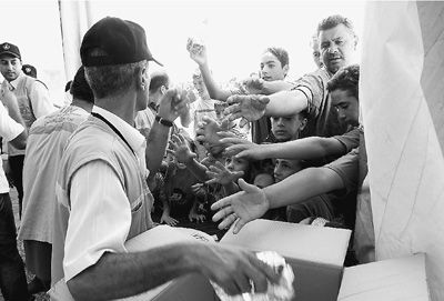 约旦于7月底在马弗拉克省开放了其境内的第一所叙利亚难民营,为不断涌入的叙利亚难民提供人道主义帮助。图为联合国难民机构工作人员向叙利亚难民分发食物。 人民视觉
