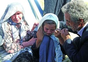 悲痛欲绝的灾区妇女和受到惊吓的女孩(下图)。遇难者中,绝大多数是妇女和儿童。新华社发