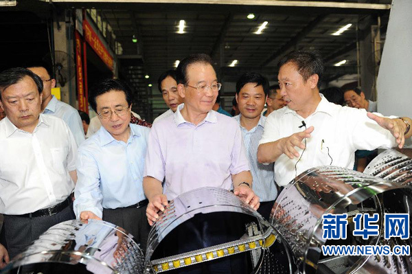 8月14日至15日,中共中央政治局常委、国务院总理温家宝来到浙江杭州、湖州、嘉兴等地,调研经济运行情况。这是14日,在海信惠而浦电器公司生产车间,温家宝向企业负责人详细了解企业生产经营情况。新华社记者李涛摄