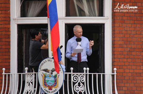 人民网伦敦8月19日电 当地时间19日下午2时,“维基解密”创始人阿桑奇如约出现在厄瓜多尔驻英国大使馆的阳台上,这是阿桑奇进入该使馆避难两个月来,首次出现在公众面前并发表公开演讲。阿桑奇并没有走出使馆,因为只要踏出使馆一步,就将立即遭到英国警察的逮捕,并按照英国最高法院的判决将其引渡至瑞典。