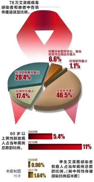 报告显示,截至2011年底,我国存活的约78万艾滋病病毒感染者和艾滋病病人中,女性占28.6%;艾滋病病人15.4万,全人群感染率为0.058%。估计2011年当年新发艾滋病病毒感染者4.8万人,其中,异性传播占52.2%,同性传播占。