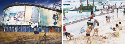 左图:网传朝阳公园沙滩排球场照片。右图:8月15日,大人孩子在朝阳公园沙滩主题乐园尽情享受沙滩的快乐。本报记者 李维娜摄