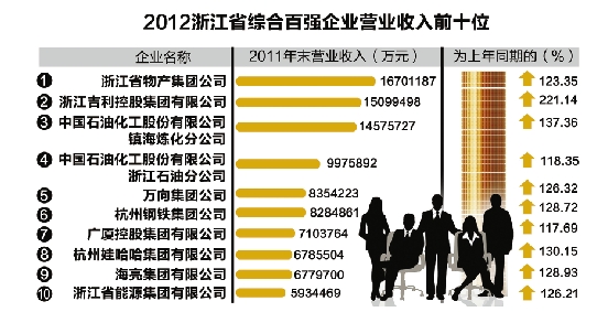 浙江在线9月14日讯 面对复杂的经济环境,浙江的百强企业构成了浙江经济的钢筋铁骨。昨天,浙江省企业联合会和企业家协会联合发布了2012综合百强企业榜,浙江物产集团、吉利控股、镇海炼化分公司位居前三甲,物产集团已经连续5年夺冠。