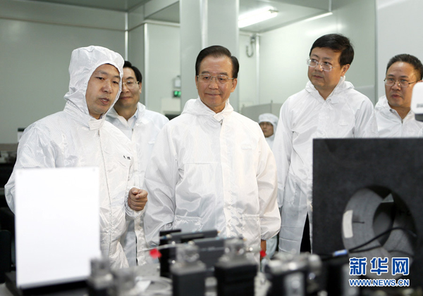 9月14日,中共中央政治局常委、国务院总理温家宝应邀到清华大学看望师生,并在学校大礼堂发表演讲。这是温家宝在机械工程学院精密仪器系IC装备重大专项实验室考察。 新华社记者鞠鹏摄
