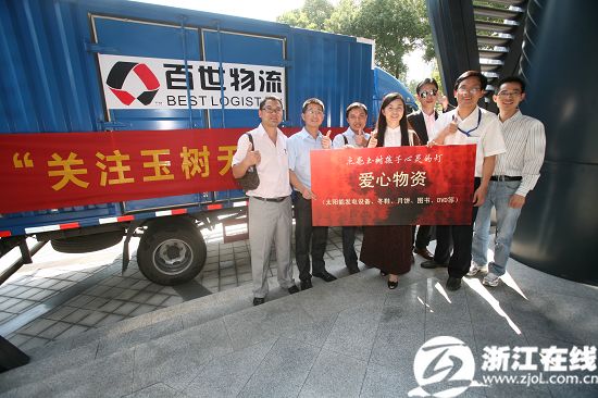在捐赠仪式上,杭州可莎蜜儿食品有限公司、苏州易伏电能科技有限公司、百世物流和浙江在线就爱心物资和一套小型太阳能发电设备进行了交接。随后,百世物流的爱心运送车正式发车,预计十五天左右能将物资运抵玉树。