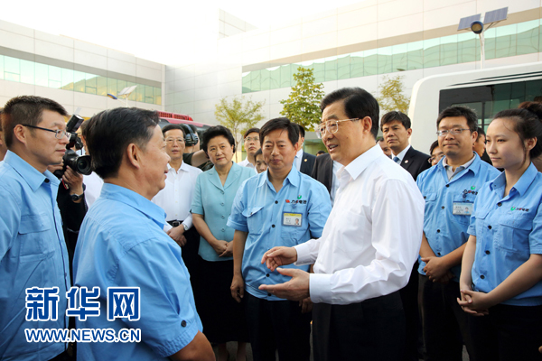 9月18日,中共中央总书记、国家主席、中央军委主席胡锦涛在天津考察高新技术企业。这是胡锦涛在天津力神电池股份有限公司同企业员工亲切交谈,勉励他们面向市场需求,推进自主创新,在推动我国新能源产业发展中再创佳绩。新华社发