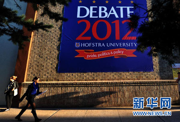 走近美国总统候选人辩论会场 10月16日,在美国纽约州霍夫斯特拉大学,工作人员走过一处总统候选人辩论的宣传海报。新华社记者王雷摄
