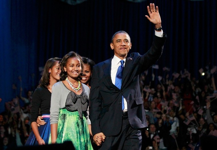 在成功连任成定局后,伊利诺伊州芝加哥市麦科米尔会展中心,欢呼声中,奥巴马在妻子米歇尔、女儿马莉娅和萨沙陪同下登上舞台。