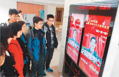 人民日报数字新媒体在全国首次用高清双频直播大会实况。在上海一些政府机关、高校、社区以及上海电信营业厅,人们可以通过人民日报电子阅报栏实时观看十八大会议实况。图为复旦大学的师生在校园通过“人民数字”电子阅报栏收看大会实况。 |