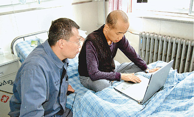 生前,田彬峰(右)在病床上编辑手册。记者 林治波摄
