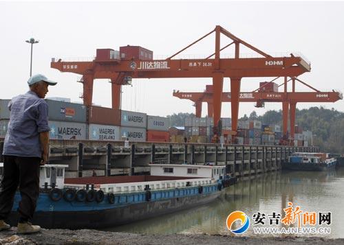 今天,川达物流集装箱码头上一派热火朝天的繁忙景象,大型集卡车将一批批外贸出口集装箱拖运到码头,港区龙门吊不停地升高降落,把一个个集装箱稳稳装入船舱内,转运海外。为了解决集装箱船舶运力不足问题,提高码头的运输能力,今年川达物流码头将新增48TEU型集装箱船舶8艘、集装箱卡车40辆,集装箱船单航次运力达到876标箱,集卡车达75辆。